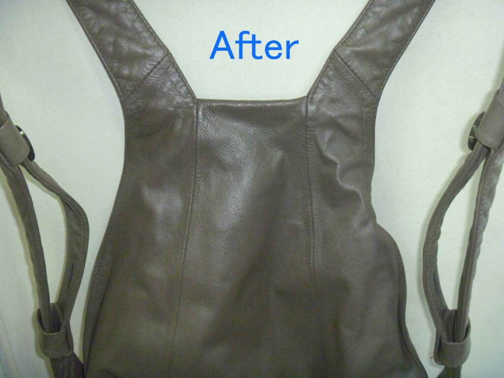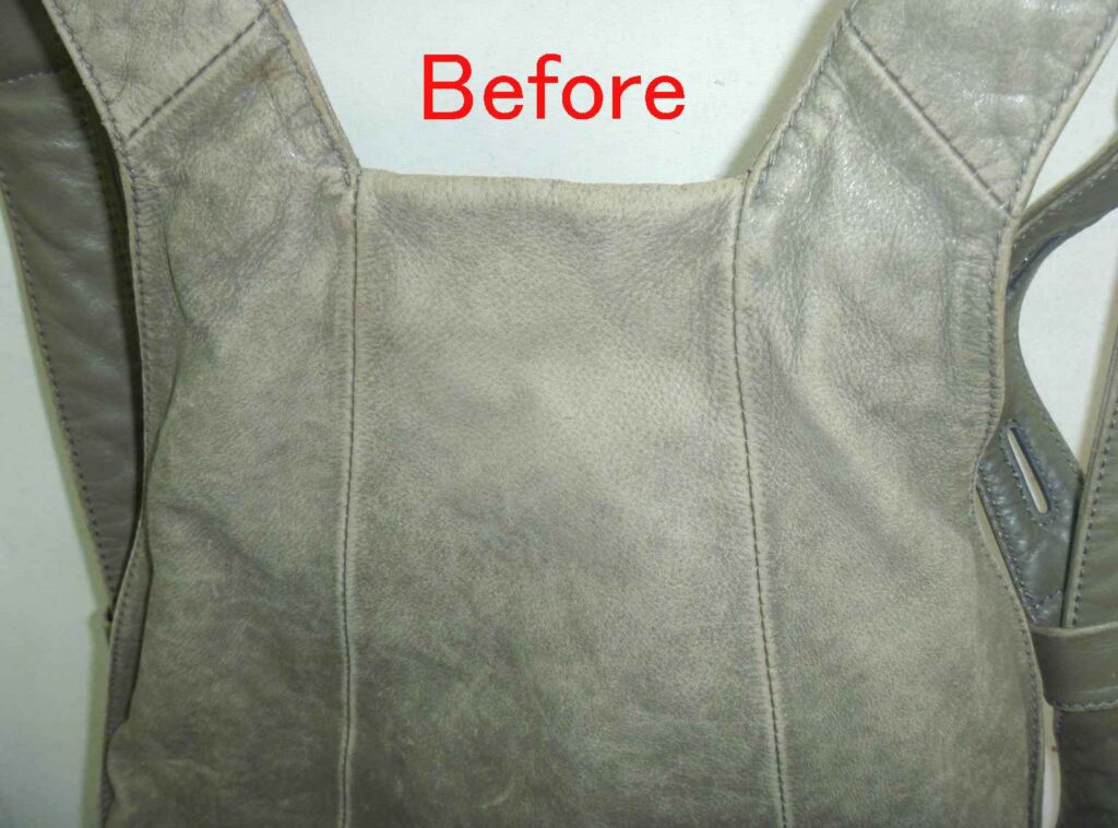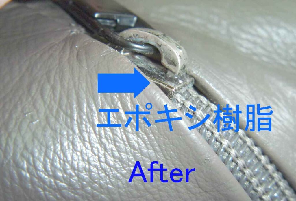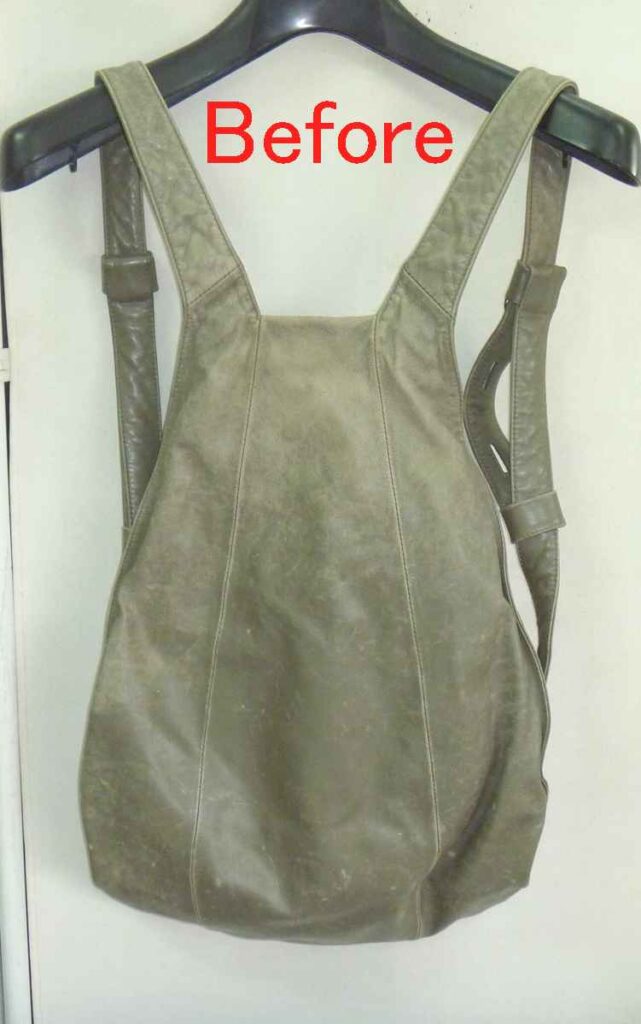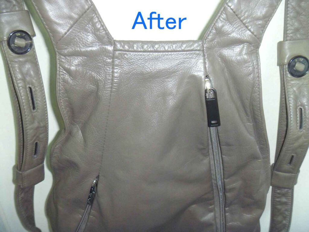 2026-01-30 / 最終更新日時 : 2026-02-02 knishikawa こんな補修も 本革リュックの色塗装と引き手追加 本革製のリュックをお持ちいただきました。非常にシンプルな形の使いやすそうなリュックでした。 表面は、オリジナルの色がほとんど無くなっていますが、左右のベルト裏にはオリジナルの色が見えているのがお判りいただけます。 全体の色の褪色を確認すると、擦れだけでなく紫外線によって色が褪色しているようです。 肩にかけると、背面になる箇所です。左右にファスナーがあり、内側はそれぞれ別の袋構造になっており、中では繋がっていません。背負うことでファスナーが隠れますので、盗難にも合いにくい構造です。これはなかなか見られない作りでした。 リュックとして背負うと、背面は隠れますのでオリジナルの色は残っていそうですが、こちら側も色の褪色もかなりありました。 背面の下部も、同じような褪色の状況でした。背面は主に擦れによる褪色が多いとは思いますが、使われ方によって変わりますので、実際のところは推測にすぎません。 お客様のご要望のもう一つが、こちらの引き手の追加です。スライダー(現在残っている金具)を引きやすくしているのが引き手です。ご覧いただいている方も、形状を思い浮かべられると思います。 こちらが弊社が選んだ、後から付けられる引き手です。お客様からは現在残っている引き手に近い物をという事でしたが、オリジナルにはブランドの刻印もされていましたので、全く同じ物の入手は出来ませんので、なるべく違和感の少ないと思った引き手を使用しています。 今回、引き手が無くなっていた原因はスライダーの上部が開いてしまったためと思われます。そのため、開いた部分を補修するためにエポキシ樹脂で開いた部分を固めています。「そんなことしないで、ペンチでスライダー上部と下部を押さえればいいじゃないか。」と考えられる方もあると思いますが、それはファスナーを知らないからです。ファスナー全体をペンチで押さえることはスライダーに無理な力を加える事なので、極力行わないでください。 全体塗装した背面の下側です。擦れや褪色は完全に回復しているのがご覧いただけると思います。 背面上部はこのように回復しています。スライダーの引き手の新しい物とオリジナルの引き手も写っていますが、違う形状というのがお判りいただけると思います。 背面全体ではこのような感じです。色の擦れや褪色は全く感じられないと思います。 表面の下部です。こちらも擦れや褪色は完全に回復しています。 光沢についてもお客様とお打ち合わせさせていただき、少しだけ光沢を出すことで決まっていましたが、さてさてこの色と光沢を気に入っていただけるかが一番の問題です。 ご来店いただける当日にお電話いただき、県外から受け取りに来ていただけました。「綺麗に元の色に戻っている。」という第一声をいただきました。オリジナルの色を推測して調色した甲斐がありました。色も光沢も、そして取り付けた引き手もご満足いただけたようでした。今回の色は大変に迷いました。弊社が使っている5つの原色の塗料を調色して作っています。複雑な色ゆえにカメラで撮影すると、グレーに見えたり少し青く見えたり、少し赤っぽく見えたりします。これは意識して作った色です。今回もやはり「ホッ。」とした瞬間はお客様にお渡しした瞬間でした。