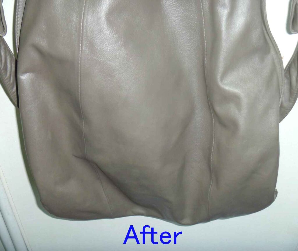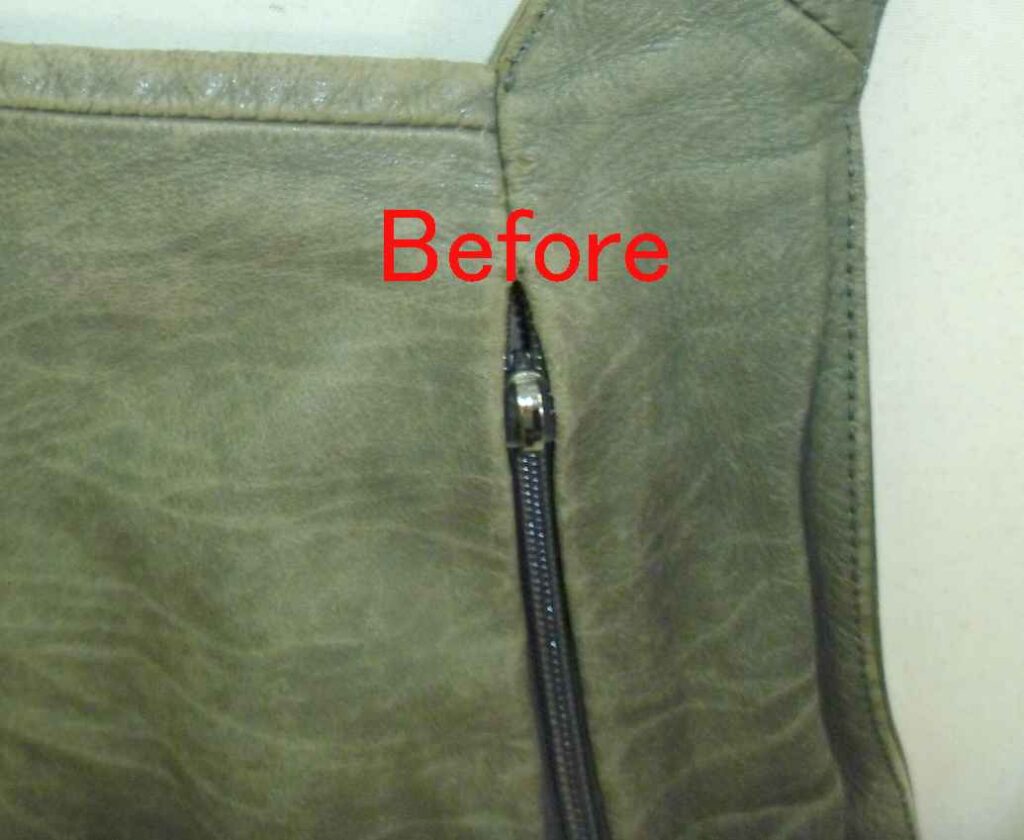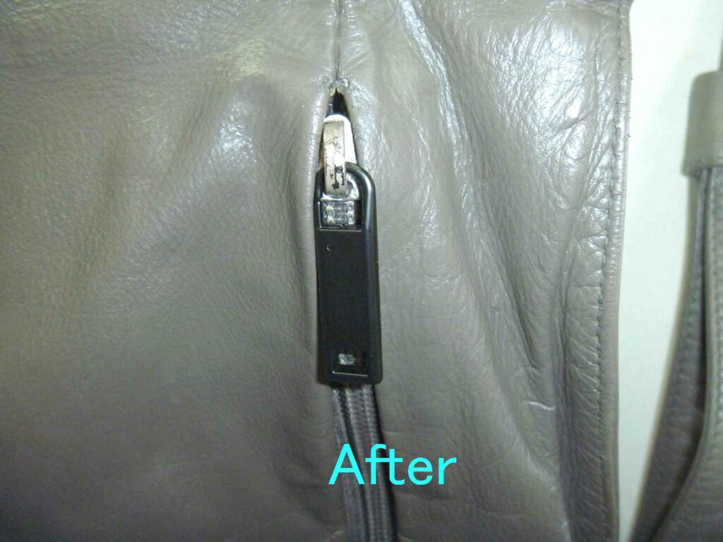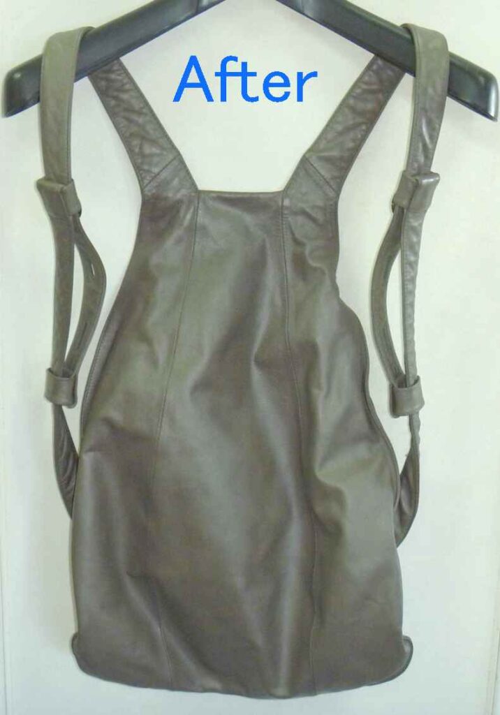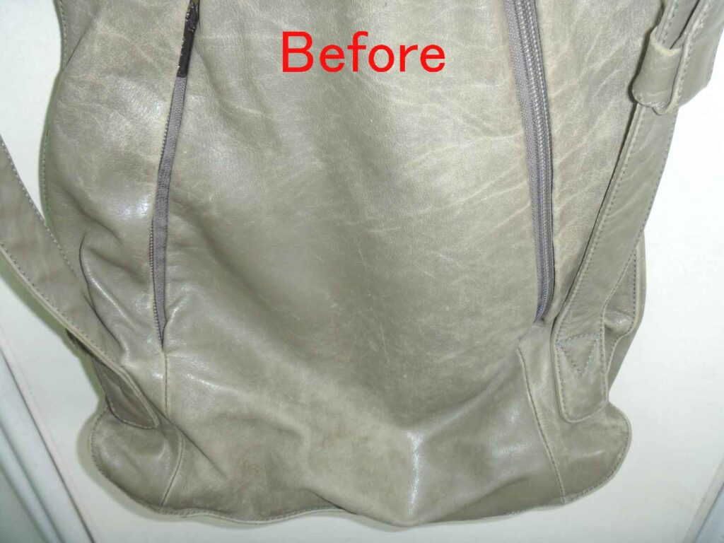 2026-01-30 / 最終更新日時 : 2026-02-02 knishikawa こんな補修も 本革リュックの色塗装と引き手追加 本革製のリュックをお持ちいただきました。非常にシンプルな形の使いやすそうなリュックでした。 表面は、オリジナルの色がほとんど無くなっていますが、左右のベルト裏にはオリジナルの色が見えているのがお判りいただけます。 全体の色の褪色を確認すると、擦れだけでなく紫外線によって色が褪色しているようです。 肩にかけると、背面になる箇所です。左右にファスナーがあり、内側はそれぞれ別の袋構造になっており、中では繋がっていません。背負うことでファスナーが隠れますので、盗難にも合いにくい構造です。これはなかなか見られない作りでした。 リュックとして背負うと、背面は隠れますのでオリジナルの色は残っていそうですが、こちら側も色の褪色もかなりありました。 背面の下部も、同じような褪色の状況でした。背面は主に擦れによる褪色が多いとは思いますが、使われ方によって変わりますので、実際のところは推測にすぎません。 お客様のご要望のもう一つが、こちらの引き手の追加です。スライダー(現在残っている金具)を引きやすくしているのが引き手です。ご覧いただいている方も、形状を思い浮かべられると思います。 こちらが弊社が選んだ、後から付けられる引き手です。お客様からは現在残っている引き手に近い物をという事でしたが、オリジナルにはブランドの刻印もされていましたので、全く同じ物の入手は出来ませんので、なるべく違和感の少ないと思った引き手を使用しています。 今回、引き手が無くなっていた原因はスライダーの上部が開いてしまったためと思われます。そのため、開いた部分を補修するためにエポキシ樹脂で開いた部分を固めています。「そんなことしないで、ペンチでスライダー上部と下部を押さえればいいじゃないか。」と考えられる方もあると思いますが、それはファスナーを知らないからです。ファスナー全体をペンチで押さえることはスライダーに無理な力を加える事なので、極力行わないでください。 全体塗装した背面の下側です。擦れや褪色は完全に回復しているのがご覧いただけると思います。 背面上部はこのように回復しています。スライダーの引き手の新しい物とオリジナルの引き手も写っていますが、違う形状というのがお判りいただけると思います。 背面全体ではこのような感じです。色の擦れや褪色は全く感じられないと思います。 表面の下部です。こちらも擦れや褪色は完全に回復しています。 光沢についてもお客様とお打ち合わせさせていただき、少しだけ光沢を出すことで決まっていましたが、さてさてこの色と光沢を気に入っていただけるかが一番の問題です。 ご来店いただける当日にお電話いただき、県外から受け取りに来ていただけました。「綺麗に元の色に戻っている。」という第一声をいただきました。オリジナルの色を推測して調色した甲斐がありました。色も光沢も、そして取り付けた引き手もご満足いただけたようでした。今回の色は大変に迷いました。弊社が使っている5つの原色の塗料を調色して作っています。複雑な色ゆえにカメラで撮影すると、グレーに見えたり少し青く見えたり、少し赤っぽく見えたりします。これは意識して作った色です。今回もやはり「ホッ。」とした瞬間はお客様にお渡しした瞬間でした。