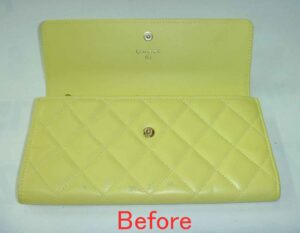 2025-11-23 / 最終更新日時 : 2025-11-27 knishikawa ブランドバック COACH手提げバッグの持ち手リペア(補修) コーチの手提げバッグをお持ちいただきました。本体にリペアした方が良い傷みはありませんでとした。 反対側も同様にリペアが必要そうな傷みはありませんでした。 お持ちいただいた理由は、持ち手の傷みでした。表面の色がポツポツと革目に沿って割れているのがご覧いただけます。 表面の革が切れてしまって、穴の開いているところもありました。穴が開いていますので、裏側に革を入れて補修する必要がありそうです。 同じ場所を位置を変えて撮影しました。コパが切れているのがご覧いただけます。 他の場所にも小さな穴が開いている箇所がありました。表面の色が無くなってしまっているところですが、写真では穴の大きさが判りませんでした。 持ち手の裏側も同様に傷みがありましたので、表面だけでなく裏面もリペア(補修)する必要がありました。 持ち手の裏側をリペア(補修)した状態です。下地処理をしっかり行って、塗料の食いつきを良い状態にしてから塗装しています。傷みの多い箇所は下地処理が非常に大切です。 表面も塗装が完了しました。色に関しては弊社で調色しています。こちらの色は「ブラック」「ホワイト」「イエロー」「レッド」の4色で調色を行って色を作っています。 表面の革が切れていた箇所をピックアップ撮影しました。画像の右手の方の一部に「プクッ。」膨れている部分があるのがご覧いただけるでしょうか?こちらが裏側に革を入れて接着してから塗装している箇所です。 革を裏に接着した部分をさらにピックアップ撮影しました。表面のキズは確認できないと思います。コパ切れしていた部分もリペア(修復)出来ているのがご覧いただけると思います。 こちらがリペア(補修)した後の持ち手の表面全体です。裏側に革を入れた部分も2箇所写っていますがお判りになるでしょうか? 持ち手は面積的には非常に狭い部分です。それでも穴開き補修以外に表面の色の作成やコパの補修など手間の掛かるのは面積に関係ありません。小さな場所の方が工賃当たりで考えると高くなってしまうのは仕方ありません。努力や経験だけではカバーしきれない部分なのです。 持ち手は、傷んでいた箇所の塗装は厚めにして、傷んでいない部分は比較的薄めの塗装になりますが、持ち手の全体塗装は行っています。塗装していない本体の持ち手根本(本体に縫製している箇所)と比較していただいても色の違和感はほとんど感じられないと思います。受け取りに来られたお客様も出来上がりにご満足いただけたようでした。