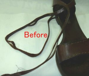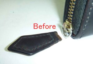 2025-06-29 / 最終更新日時 : 2025-09-26 knishikawa ブランドバック GANZOトートバッグの色補修 ガンゾーのトートバッグをお持ちいただきました。持ち手やバッグ本体には傷みはありませんでした。 お持ちいただいた理由はこちらの変色です。バッグに入れておられた食べ物がこぼれてしまったとの事でした。 ブランドの刻印が無い、背面を確認しましたが、同様に変色している部分が確認できました。 同様にピックアップ撮影してみました。変色範囲は表面よりも大きいようです。 底面も撮影しましたが、こちらは色がかなり濃いこげ茶色でしたので、変色は見られませんでした。上の方に側面が一部写っていますが、こちらにも変色がありました。 上の方に写っている部分を比較いただくと、側面の改善状態がお判りいただけると思います。 施工後の背面です。バッグの下側が濃く見えますが、こちらはフラッシュ撮影のために濃淡が出ているためです。 背面全体を撮影したものです。変色が無くなっているのがお判りいただけると思います。コンパクトカメラで適当に撮影していますので、全体撮影では光の量が不足しているようです。 ブランド名の刻印がある表面のピックアップ撮影ですが、光の加減でどうしても上下の濃淡が出ていますが変色が無くなっているのはお判りいただけると思います。 ブランド刻印がある面の全体撮影です。こちらも光量不足が感じられます。そろそろコンパクトカメラは考え直した方が良いかもしれませんね。 そのため、GANZOブランドの刻印部分をピックアップ撮影しました。「黄色の強い茶色」「赤の強い茶色」が確認できます。さらに濃淡で見ていただくと、革の表情には多くの色があるのが判っていただけます。ただ、持ち手は塗装しませんので、持ち手の色合いは下記の施工後の写真と比較いただければ思います。 同様に、施工後のブランド刻印部分をピックアップ撮影してみました。「GANZO」のブランド刻印が少し目立たなくなっています。刻印の場合は全体塗装するときに一気に塗装するためです。全体的には黄色が強い茶色が多くなり、赤が強い茶色は抑えられています。その理由は変色して濃くなった茶色を明るい茶色に戻すためには、明るい茶色を塗る必要があったからです。しかしながら、塗装していない持ち手と比較しても違和感は無いと思います。このように、色は非常に微妙な調整が必要なのです。お客様にお持ち帰りいただいた時も、色に関しての違和感は無かったようで、ホッと一安心でした。それなのに、同様部分の撮影で、これだけ色合いが変わってしまっているのは「そろそろカメラを新しい物に入れ替えないと……。」とつくづく感じてしまいました。