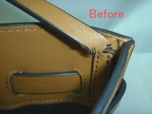 2025-09-08 / 最終更新日時 : 2025-10-20 knishikawa ブランドバック ROPEハンドバックのプチリメイク ロペのハンドバックをお持ちいただきました。ほとんど使用感は無く、傷みもありませんでした。 お客様のご要望は「持ち手の根本が内側にあるため、物を入れて持ち歩く時に外側のスペースが開いてしまうので持ち手の位置を変えて欲しい。」というプチリメイクのご要望でした。 オリジナルはブランドマークの近くに持ち手の根本が縫製されていました。ブランドマークの上部に見える〇は磁石で、外側の〇と磁力でくっついてポケットのように使う構造でした。 持ち手の根本の縫製を外した状態です。縫製を外した針穴が残っているのがご覧いただけます。こちらは内側になりますので、穴はそのまま残して良いとのお話でした。 持ち手の根本の革を移動させて、新たに縫製した内側部分です。縫製は手縫製とミシン縫製とのハイブリッド施工をしています。いくつか茶色い点がありますが、こちらは糸の端面を熱処理しているポイントです。真ん中にある〇は内側と磁力でくっつく部分です。 持ち手の根本を移植した、外側部分をピックアップ撮影しました。縫製箇所はオリジナルの糸の位置に合わせていますので、違和感は無いと思います。 持ち手の根本の革は、オリジナルの縫製はI型でしたが、力を分散するために左右の縦の縫製を追加しました。外側の縫製に茶色い点はありません。糸の端面を熱処理したのは全て内側で行っているからです。 お客様には「これで使いやすくなった。」と喜んでお持ち帰りいただきました。今回、お客様のプチリメイクのご要望は実使用を考えると大変理にかなっています。磁力を使ってポケットのように使う仕様はアイデアとしては良いと思いますが、物を入れると開いてくるというのは予定外だったのかもしれません。メーカーさんはどうしてもデザインに重きを置かれますが、できれば実使用の状況は重視いただきたいものです。